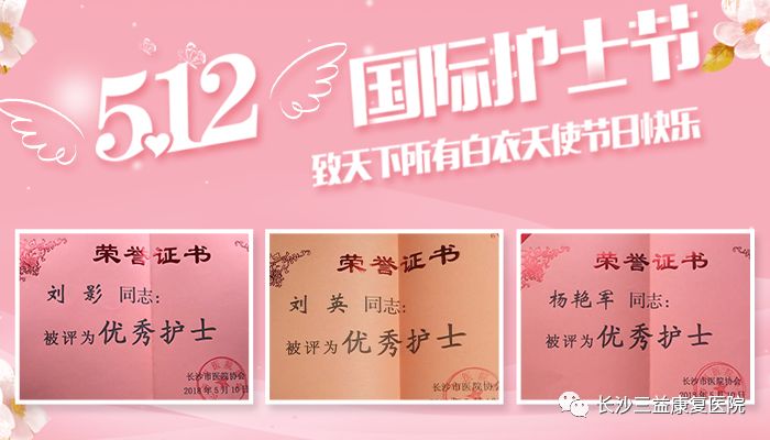 为庆祝2018年5.12国际护士节,弘扬南丁格尔救死扶伤、关爱生命、无私奉献的职业宗旨,表彰奖励在护理工作岗位上做出突出贡献的先进模范人物,长沙市医院协会决定对杨艳军、刘芳芳等136为同志授予优秀护士称号,予以表彰。长沙三益康复医院杨艳军、刘英、刘影被评为优秀护士。